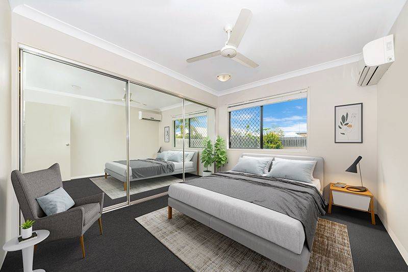 • Master bedroom with large mirrored built ins, ceiling fans and split system air conditioning