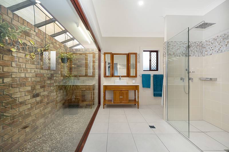 • Extra large master bedroom with walk in robe, stunning floor to ceiling glass fronted ensuite with large shower, private toilet, split system air conditioning, ceiling fan and private access to the swimming pool