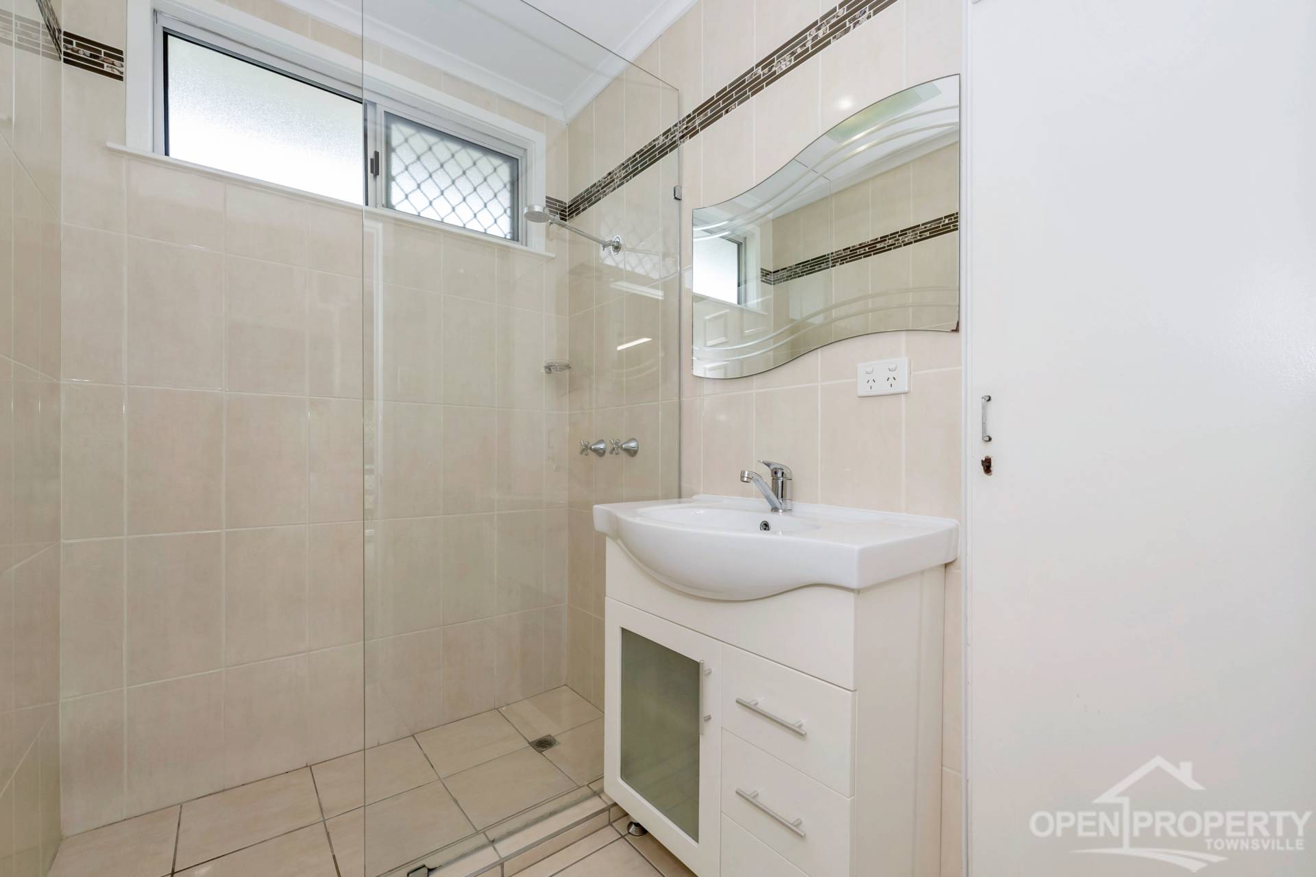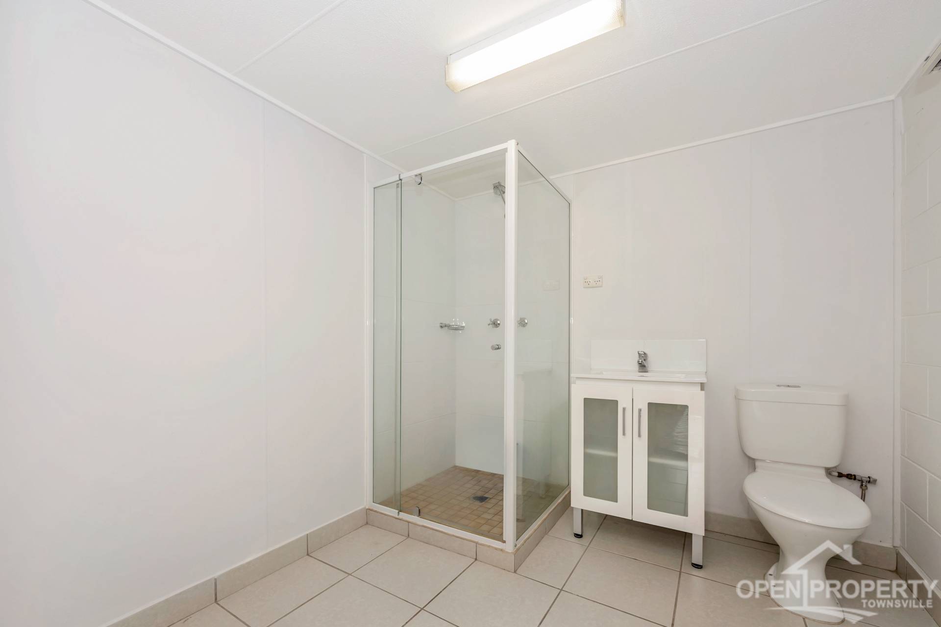 • Modern bathroom with walk in shower, vanity and built in cupboard plus separate toilet