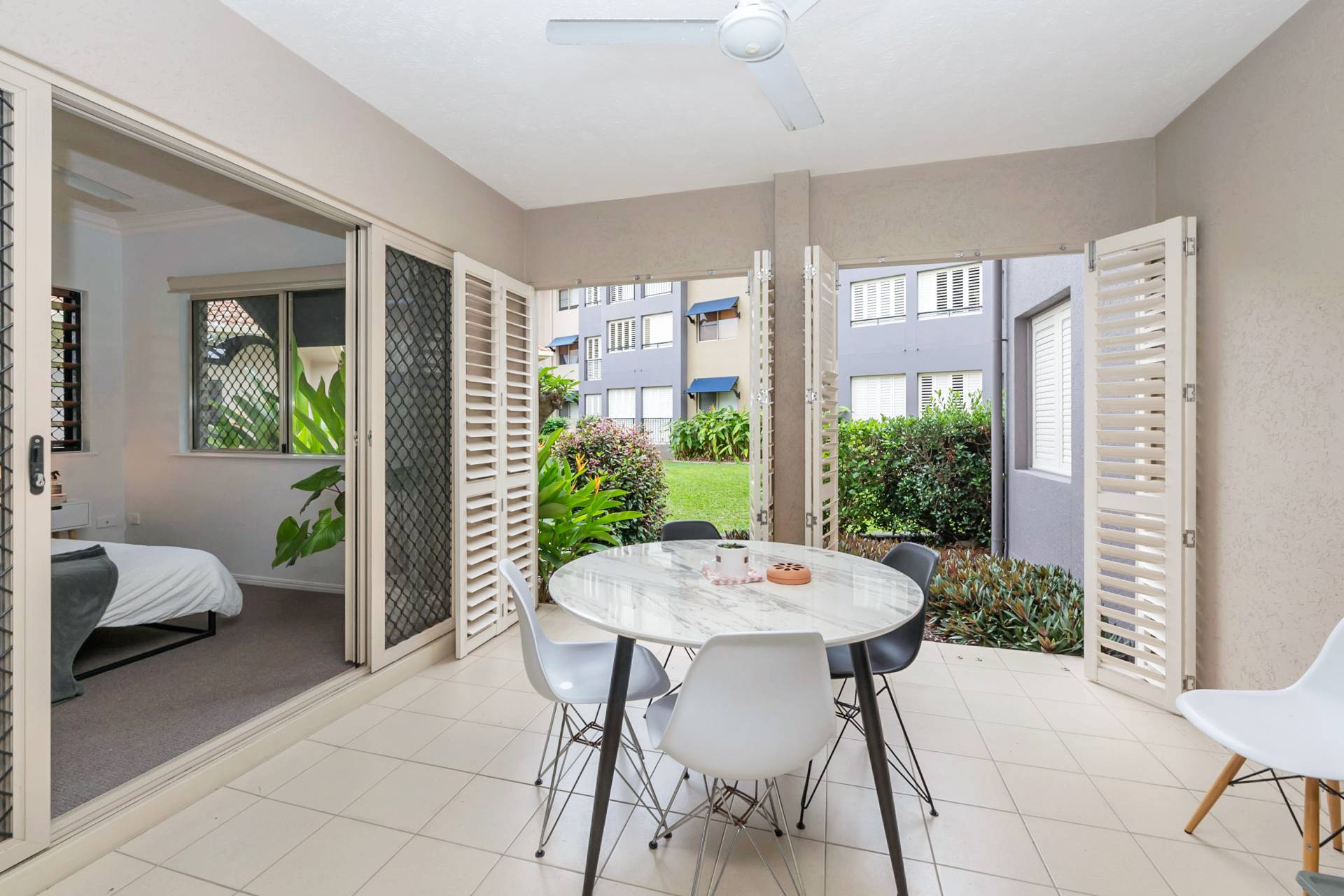• Enclosed tiled balcony with aluminum shutters