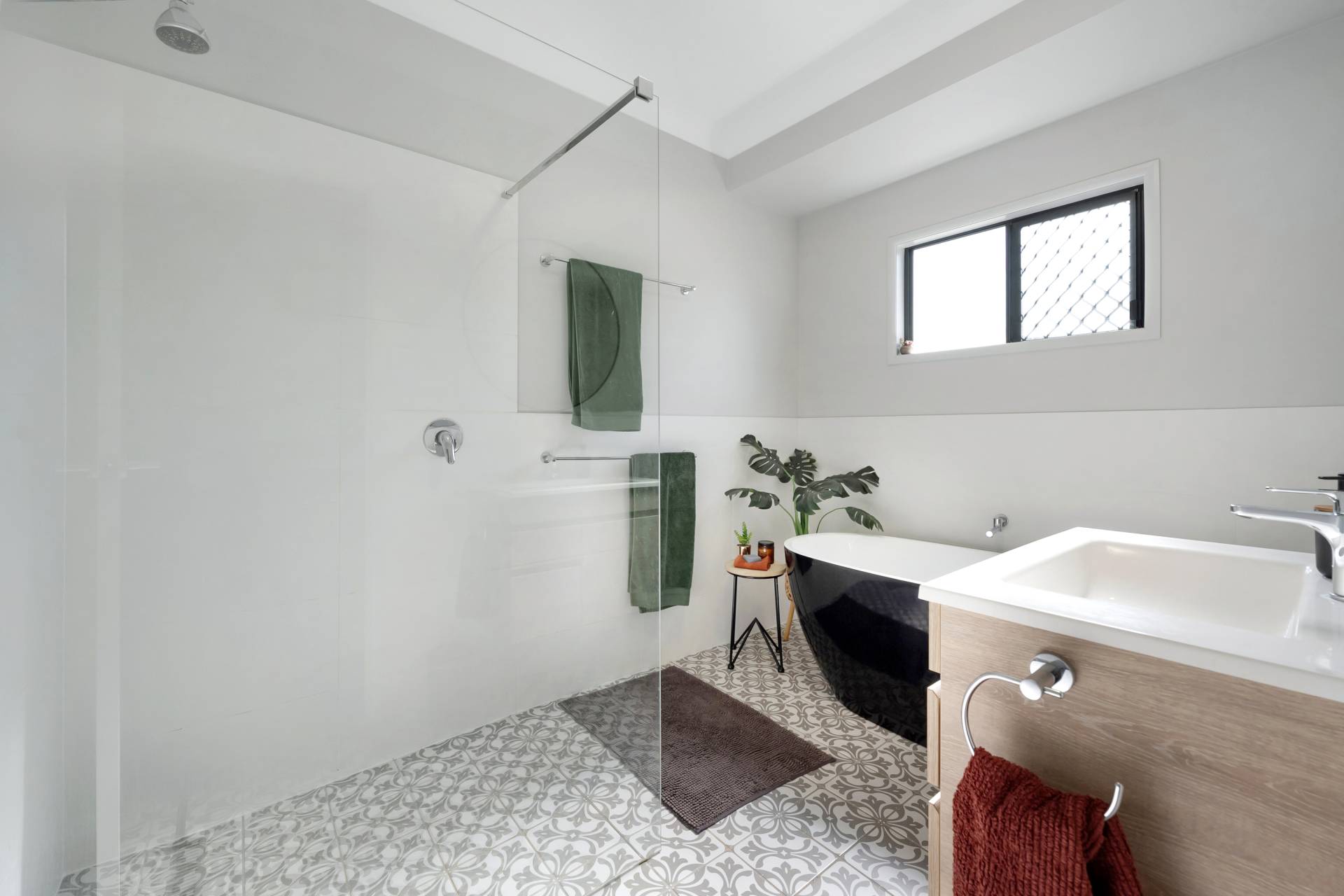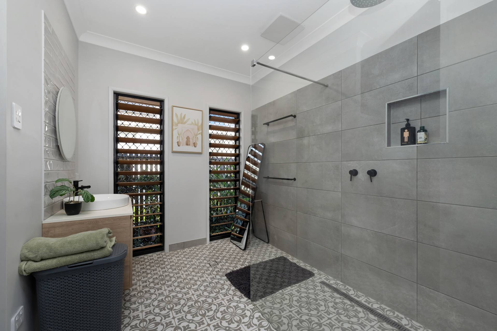• Contemporary ensuite features a spacious walk-in shower, elegant patterned floor tiles, matte black fixtures