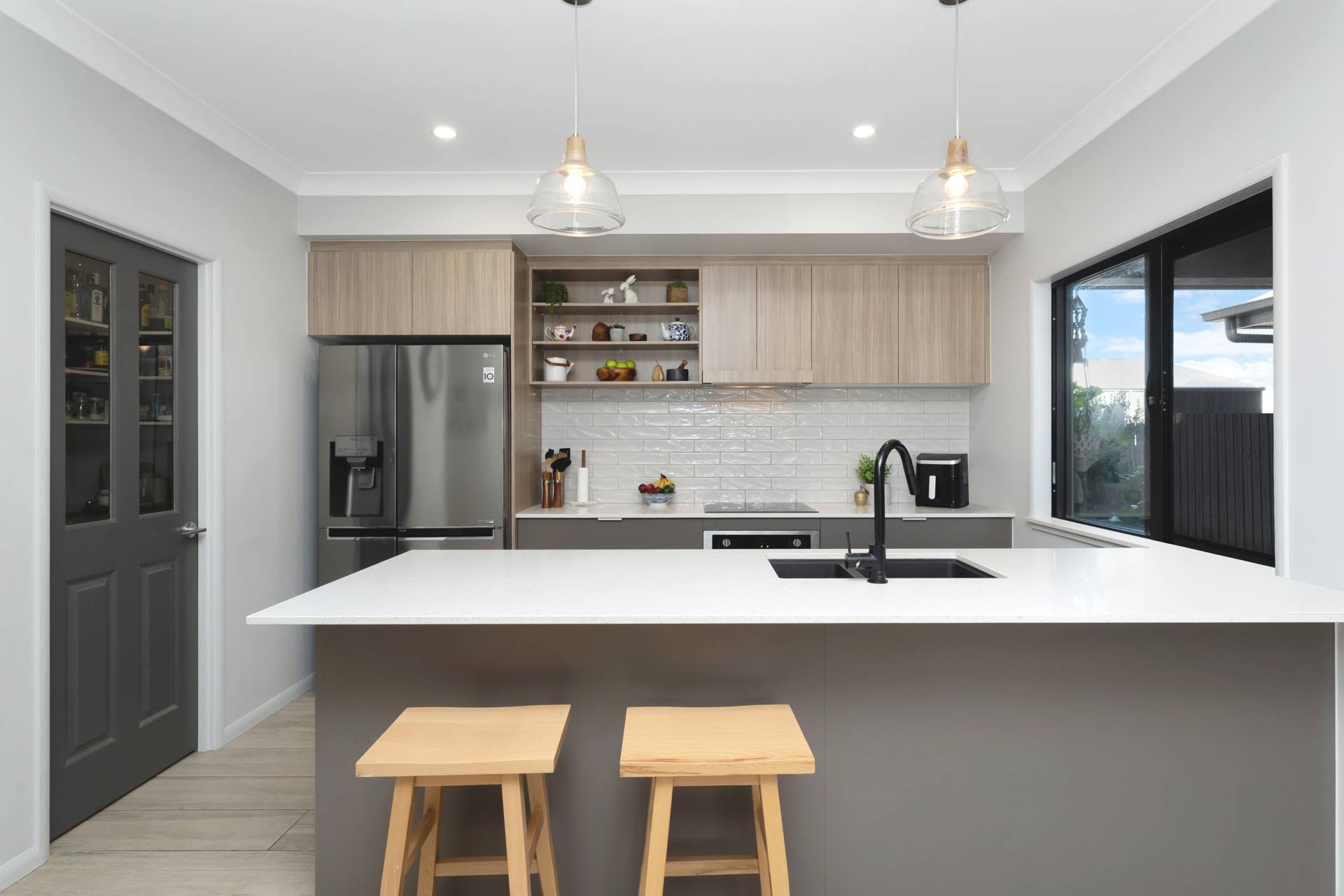 • Modern kitchen boasts a sleek design with a spacious island bench, pendant lighting, timber-look cabinetry, matte black fixtures, and top-of-the-line appliances, all complemented by a huge walk in pantry.