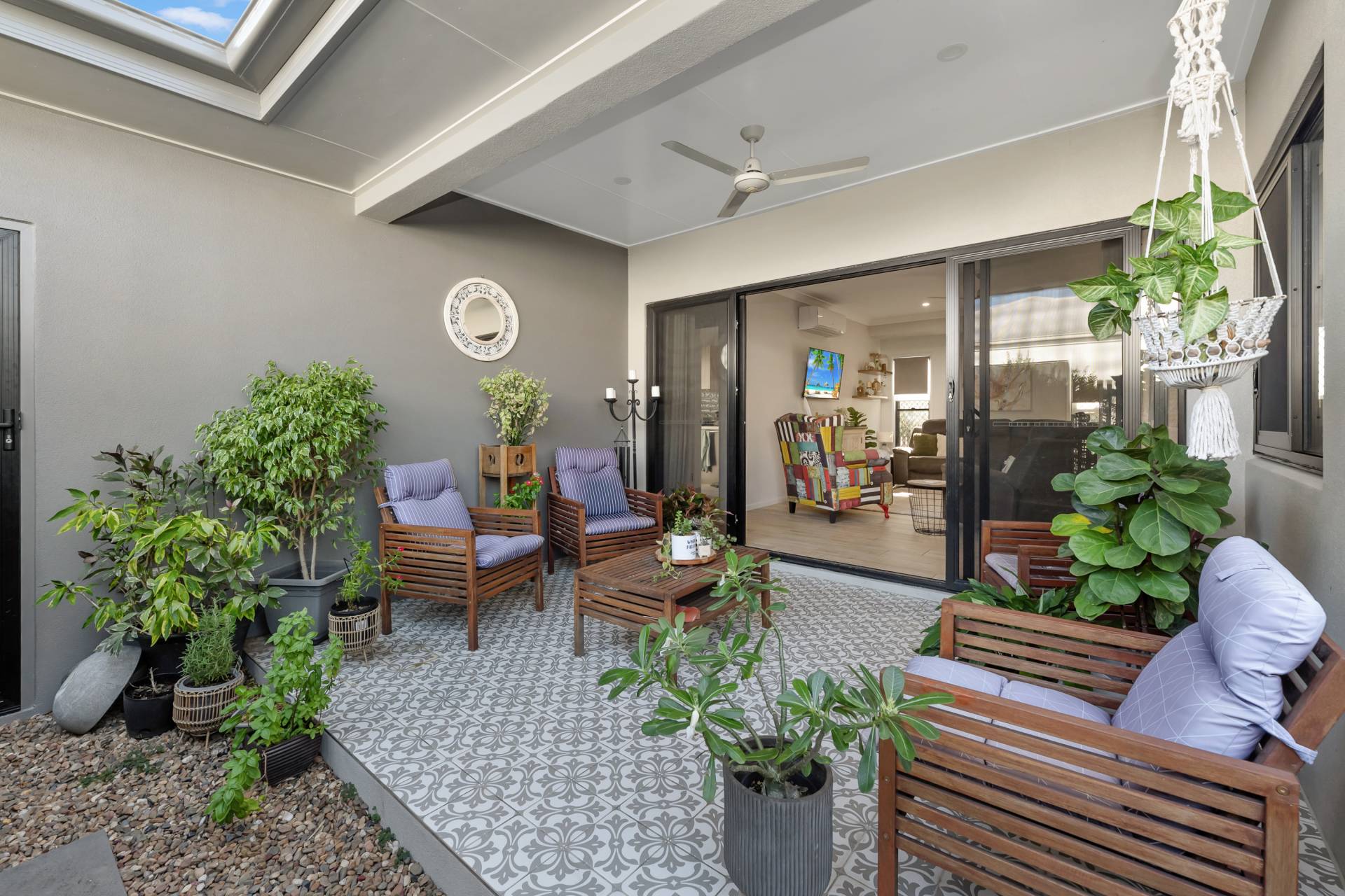 • Exquisite inviting outdoor patio features stylish patterned tiles, lush greenery, and a ceiling fan, seamlessly connecting to the indoor living area through large sliding doors for perfect indoor-outdoor living.