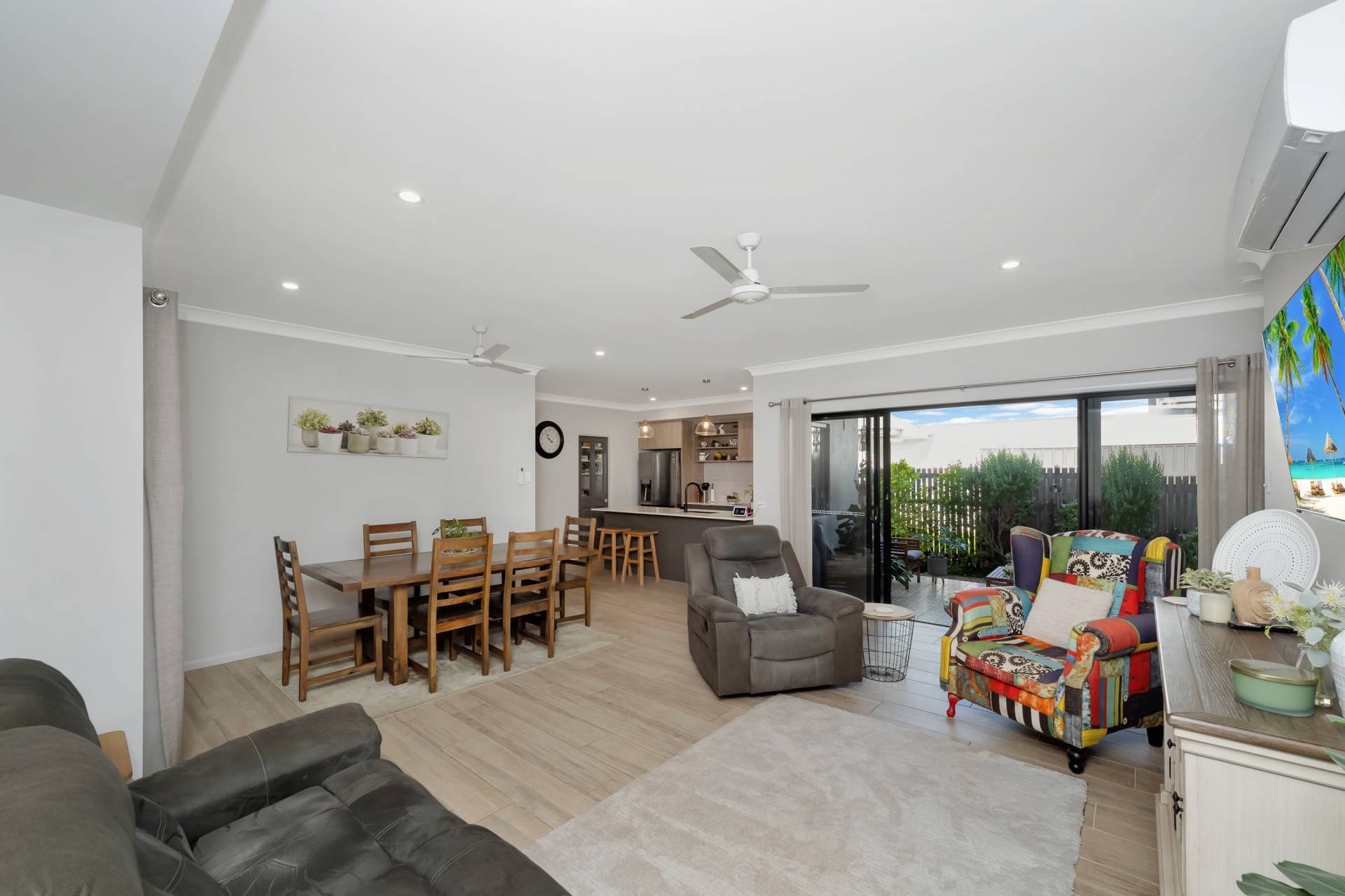 • Light-filled open-plan living and dining area featuring timber-look flooring, ceiling fans, air conditioning, and seamless indoor-outdoor flow through sliding glass doors